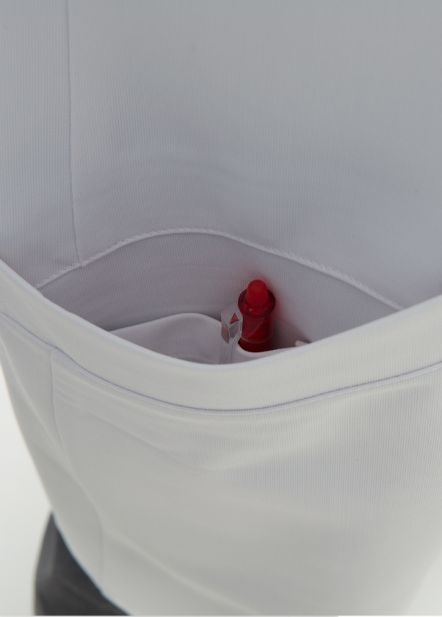 美しいシルエット、そしてこだわりのボタンと裏地を備えた診察衣です。