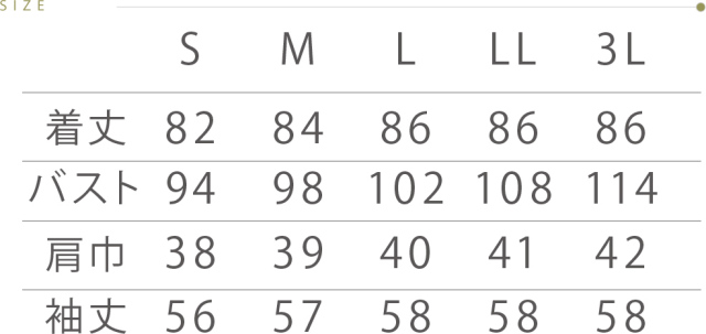 サイズ 着丈 バスト 肩巾 袖丈 S 82 94 38 56 M 84 98 39 57 L 86 102 40 58 LL 86 108 41 58 3L 86 114 42 58