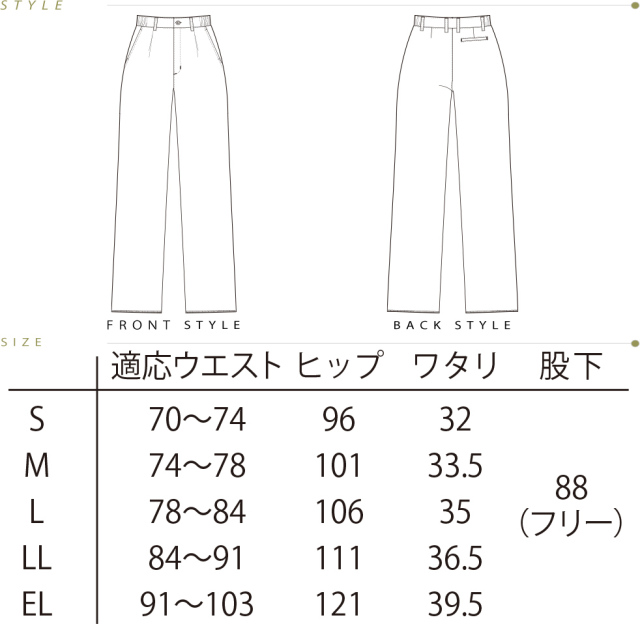 サイズ 適応ウエスト ヒップ ワタリ 股下 S 70~74 96 32 88(フリー) M 74~78 101 33.5 88(フリー) L 78~84 106 35 88(フリー) LL 84~91 111 36.5 88(フリー) EL 91~103 121 39.5 88(フリー)