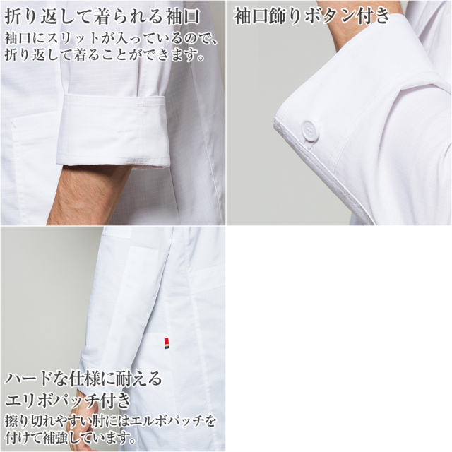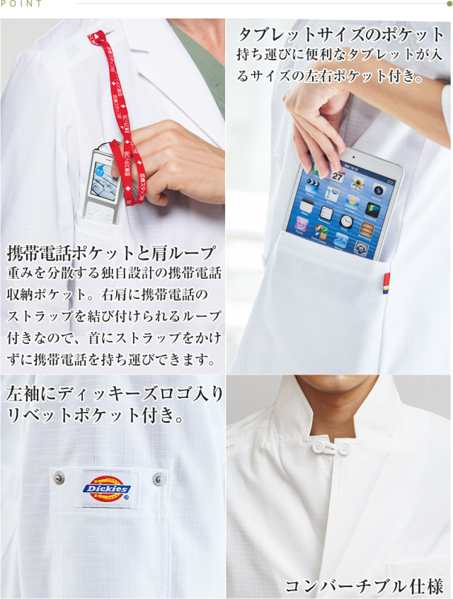 ディッキーズとのコラボシリーズのカジュアルなメンズドクターコートです。過酷な条件下にも耐えられる耐久性、ラフな着心地と動きやすさ、ハードな医療現場を軽快にサポートするドクターコート。格子状の織りは生地が裂けても途中で止まるように軍服などでもみられる生地の織りテクニックで、高い強度を誇ります。表面感のあるリップストップやダブルステッチがかっこいい雰囲気を作り出しています。左肩にはリベット付きのポケットを装備。粗野なリップストップの織り柄のある素材感が男らしいデザインのディッキーズの男性用ドクターコート。
