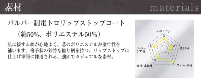 肌に接する綿が心地よく、芯のポリエステルが堅牢性を補います。格子状の独特な織り柄を持つ、リップストップに仕上げた軍服に採用される、強固でカジュアルな素材です。 - ●POINT