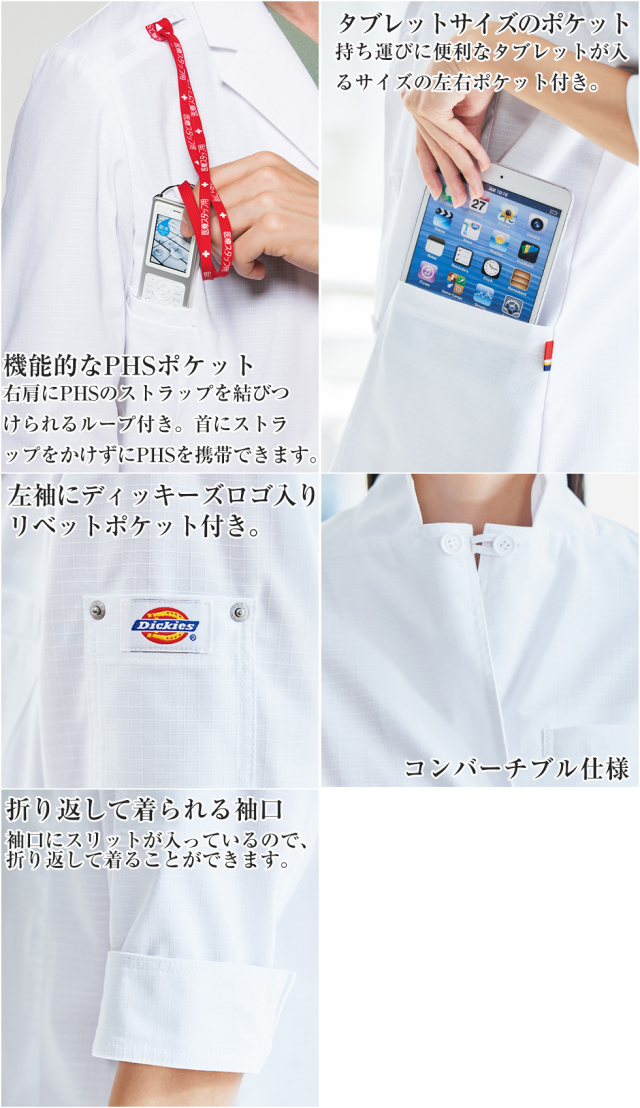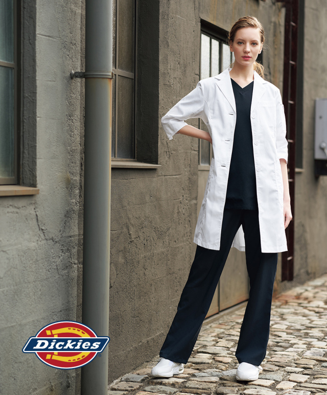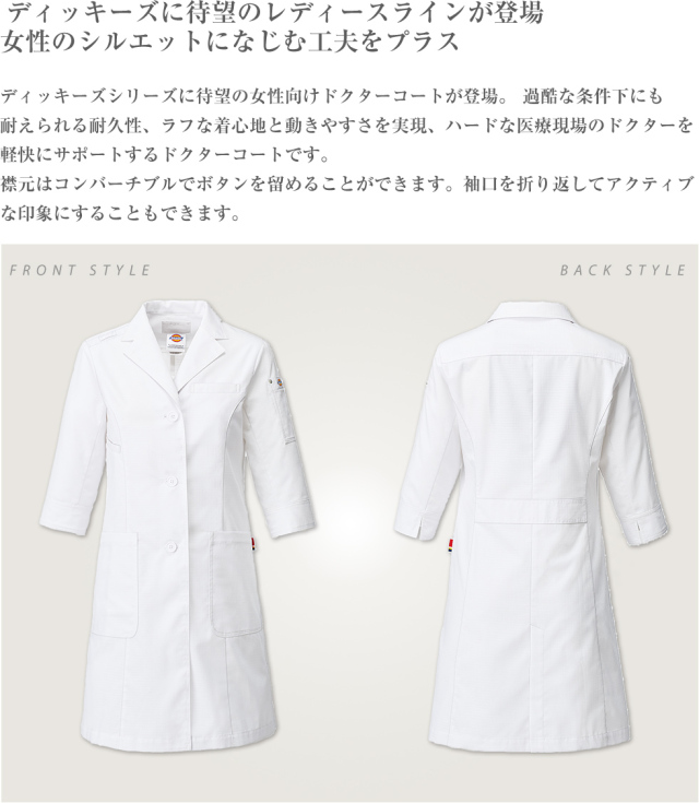 男女問わず大人気のDickies(ディッキーズ)シリーズから、大人気のDickies(ディッキーズ)の女性用ドクターコート。女性らしくタイトなシルエットながら、収納性抜群の使いやすいコート。襟元はコンバーチブルでボタンを留めることができ、袖口を折り返してアクティブな印象にすることも可能。使用している生地「パルパー制電トロ リップストップ コート」は肌に接する綿が、洗いざらしでも心地よい肌触り。格子状の織りは、生地が裂けても途中で止まる高い強度。 左肩にはリベット付きのポケットを装備したディッキーズのレディースドクターコートです。