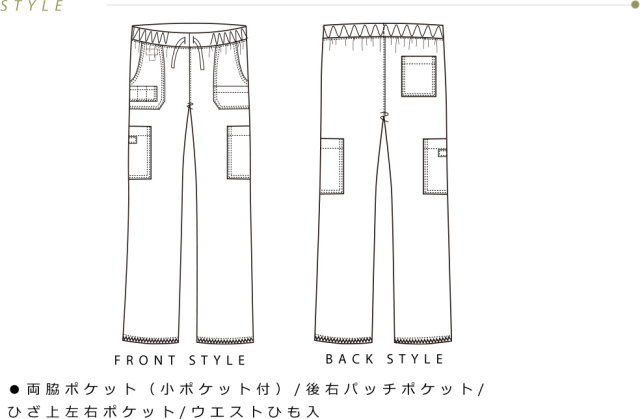 - ●両脇ポケット(小ポケット付)/後右パッチポケット/ひざ上左右ポケット/ウエストひも入
