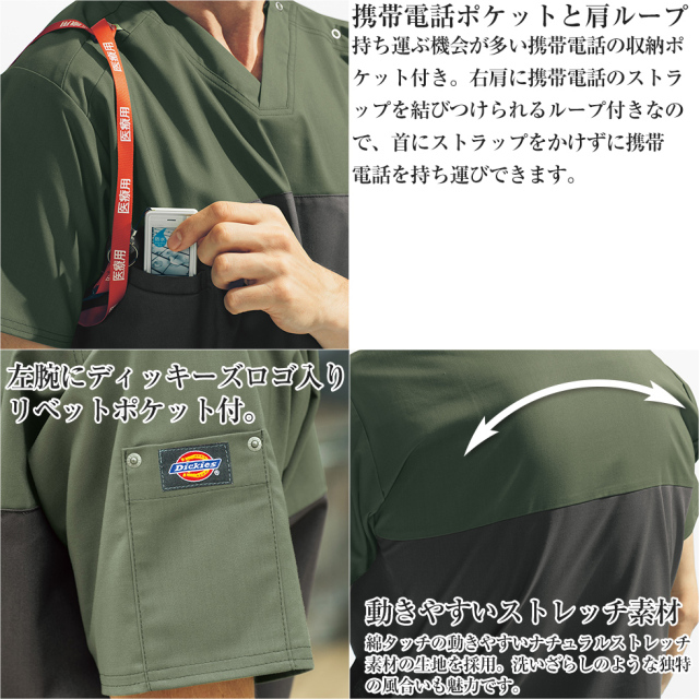 人気のディッキーズシリーズのバイカラーがオシャレな男女兼用スクラブ。大胆な切り替え配色もディッキーズならではのデザイン。日本人の体型にジャストフィットし、軽快な現場ワークをサポートします。動きやすいストレッチ素材を使用し、汗の吸い取りも良く、乾きやすくドライな着心地が魅力のスクラブ。右肩には、差し色でストラップを通せるループを装備。ストラップを通した後は、脇下にPHSを収めることができるポケットにイン。シワにもなりにくいイージーケアで、ラフな着こなしができるディッキーズのユニセックススクラブ。