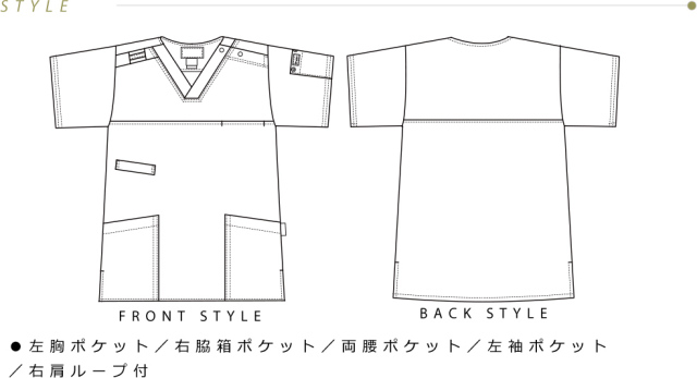 - ●左胸ポケット/右脇箱ポケット/両腰ポケット/左袖ポケット/右肩ループ付