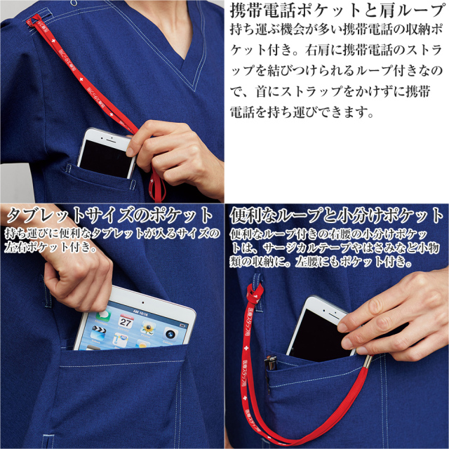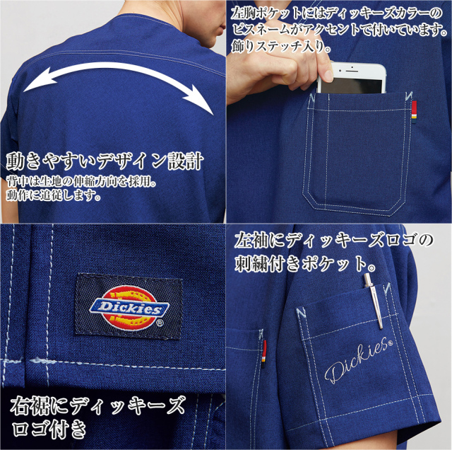 大人気のDickies(ディッキーズ)シリーズのスクラブ。両脇ポケットは一般的なタブレットサイズに対応。携帯ストラップを通す肩ループや小分けポケットなど機能面も充実したスクラブに仕上がりました。ダブルステッチや左肩ポケットには斜めに「Dickies」の刺繍も入り、カジュアルでおしゃれな印象に。 「ION MIX シャンブレー」はポリエステル100%、洗濯性に非常に優れたシャンブレー調素材。 ストレッチ性もあり、吸汗速乾性に優れたディッキーズの男女兼用スクラブです。