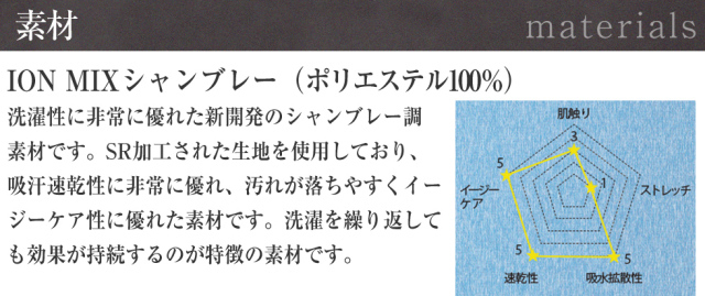 洗濯性に非常に優れた新開発のシャンブレー調素材です。SR加工された生地を使用しており、吸汗速乾性に非常に優れ、汚れが落ちやすくイージーケア性に優れた素材です。洗濯を繰り返しても効果が持続するのが特徴の素材です。 - ●POINT