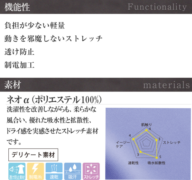 透け防止素材、防汚防湿、制電性、吸汗性、ストレッチ - ●POINT